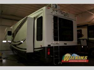 Triple Slide Fifth Wheel w/Rear Living Area Including 2 Glider Recliners w/End Table & Overhead Cabinet, Sofa & Dinette Slide, Ent. Center/Pantry/Refrigerator/3 Burner Range & Double Kitchen Sink Slideout, Opt. Kitchen Island, Step Up To Bedroom & Side Isle Bath w/Angle Shower or Opt. Tub, Cabinet, Lav., Queen or King Bed Slide w/Chests, Shelves, Wardrobes, One-Piece Washer/Dryer, Sliding Mirror Doors on Wardrobe and Much More.